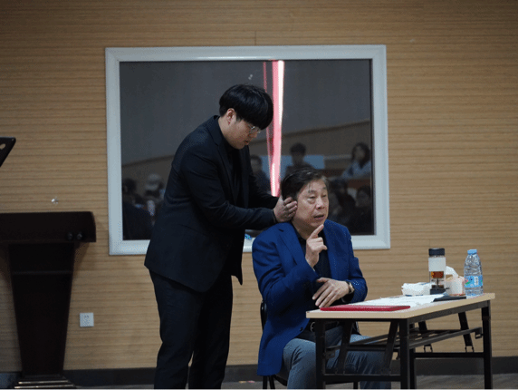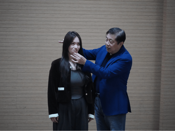 在实践指导环节,赵登营聆听了公司六名员工的演唱,并对每位员工的演唱风格和表现进行了细致的点评。赵教授严谨治学的精神感染着每一个人,针对员工的具体问题,他逐一进行纠正,从上台举止、呼吸、发音到元音咬字、共鸣通道的开启,他以身示范,培养员工形成正确且全面的声乐理念。同时,他强调演唱时要时刻关注自身的歌唱状态,对腔体的控制要及时调整。在歌曲的情感处理方面,赵登营建议员工要深刻地了解作品背景故事,把握作品风格及情感,融入角色,从而达到感情渲染的效果。在三小时的授课过程中,赵登营诙谐幽默、言传身教的授课方式给大家留下深刻印象,引起了在场师生们的阵阵掌声。