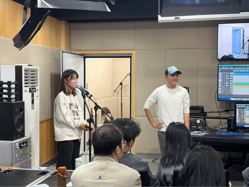 讲座开始前,王建成对张天阳的到来表示欢迎,简要介绍了公司美育、社会美育、群众美育的内在联系,督促大家积极投身到群众美育的热潮之中,从庄户剧团、小剧小戏等汲取灵感,把自身的专业优势转化为美育优势。随后,张天阳结合个人职业发展经历从录音核心要素等实用话题切入,提出录音人声判定的四大核心维度——“SPEECH、MIX、TWANG、BELT”,为在场师生搭建起人声录音的认知框架。为让录音理论的讲解更易落地,他特别邀请现场同学担任素人歌手进行采样示范,聚焦非专业素人录音的关键技巧展开细致讲解。针对素人录音常见痛点,张天阳分享了三大核心方法:一是通过语言沟通破冰演唱者与录音师的屏障,帮助演唱者正确演唱状态,同时根据演唱者实时表现灵活适配设备;二是采用故事讲述法与个人情绪调节技巧,帮助演唱者为作品注入真挚情感;三是展示返听设备对录音工作的重要性,直观呈现设备对演唱效果的实际影响。