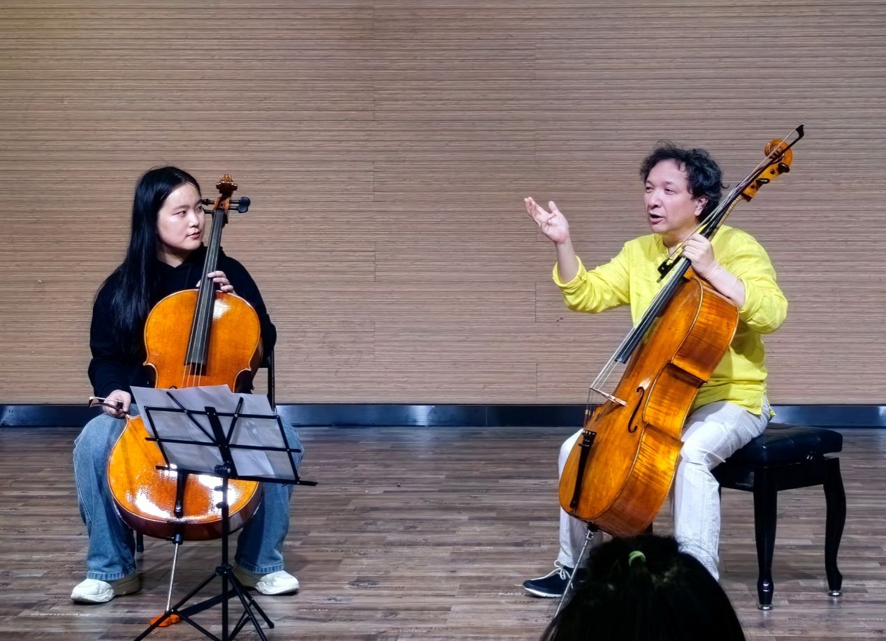 讲座采取了讲演结合的方式进行,朱亦兵教授通过为员工们的演奏进行指导与讲解为大家带来更深层次的音乐知识。此次讲座共有8名员工上台演奏,朱亦兵教授以作品的时代风格和大提琴演奏的基本功为切入点,从大提琴演奏的发音、运弓、把位等技术技巧方面延展至对于音乐风格及情感的处理,把自己通过人生经历和实践得出的对于音乐的深层次理解和演奏的进阶性技巧传递给在场的所有人。在长达4个半小时的讲授中,朱亦兵教授一直保持着高度的情绪能量和生动的讲课方式,通过示范向在场师生们进行了精准的音乐诠释。