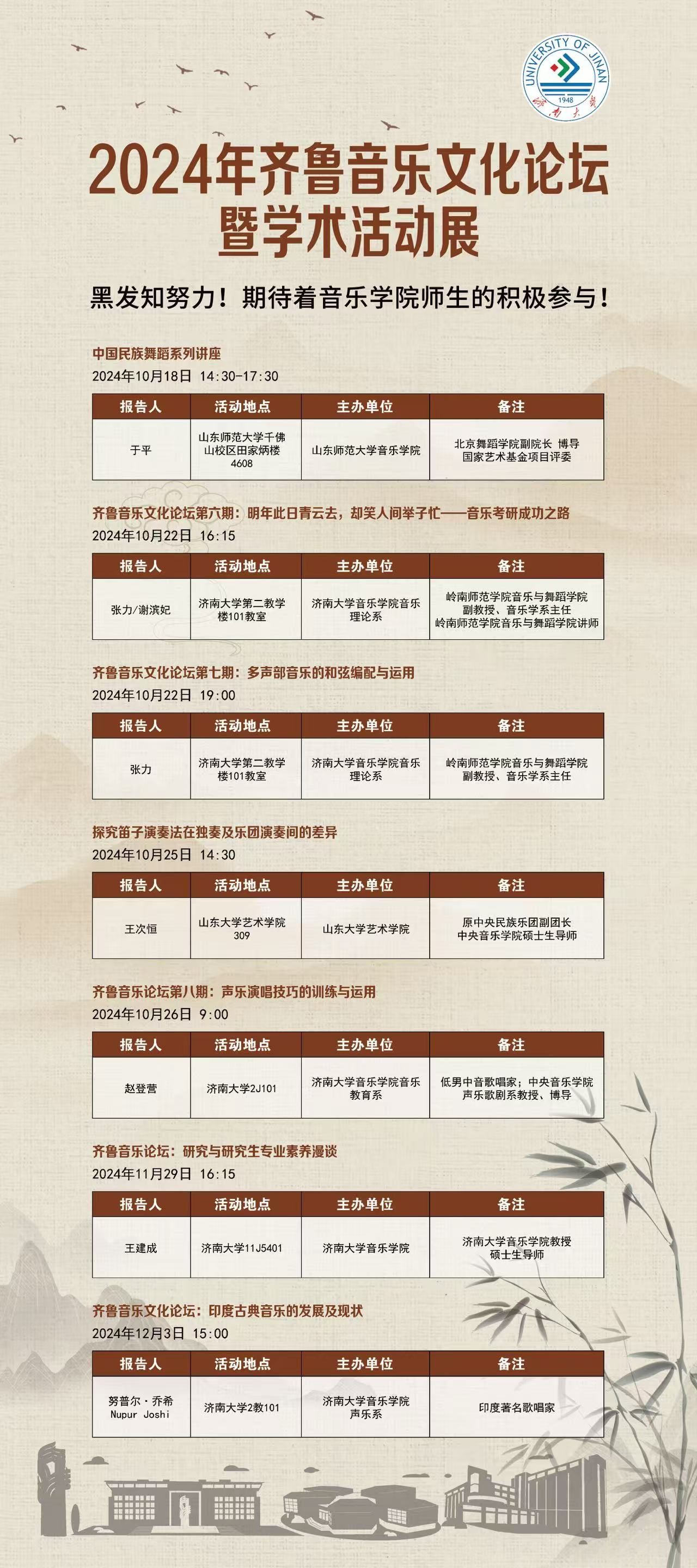 为营造浓厚的学术、科研、教研氛围,提高公司教学、科研水平,提升人才培养质量,进一步加强学科专业建设,增强对外学术交流的积极性,充分调动员工参与学术活动的积极性,2024年锐意打造公司学术品牌——齐鲁音乐文化论坛,在各系和兄弟公司的共同努力下,公司已成功举办齐鲁音乐文化论坛六场,秋季继续开讲,计划全年举办二十场。期待对齐鲁音乐文化感兴趣的广大师生积极关注、积极参与!