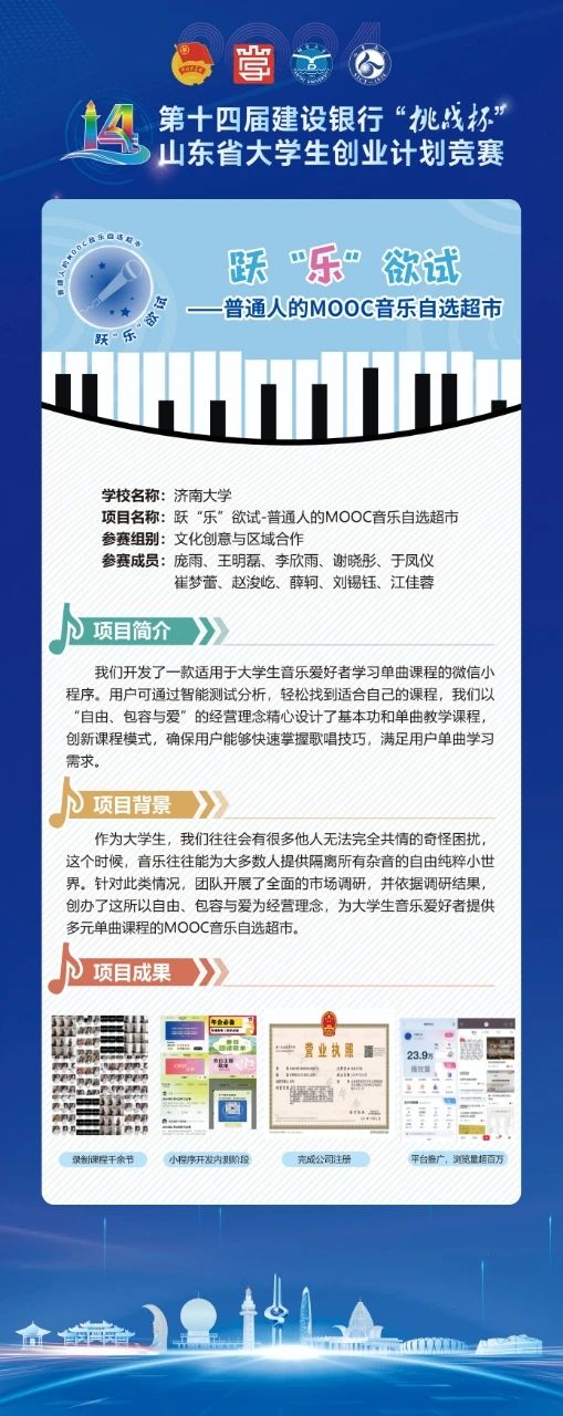 跃“乐”欲试——普通人的MOOC音乐自选超市项目基于信息碎片化时代民众追求高效率活动的背景,在前期市场调研阶段时我们发现市场中存在单曲学习需求,并且绝大多数老员工音乐爱好者想拥有个性化程度高、灵活性强、富有人文关怀的音乐课程。基于调研结果,项目开发了一款微信小程序,为老员工音乐爱好者提供多元单曲课程以供使用学习。课程组成员创新式设计全新教学法,小程序内嵌智能水平评估与推荐系统、情感交流互动版块,为用户形成专属自己的个性化音乐世界。