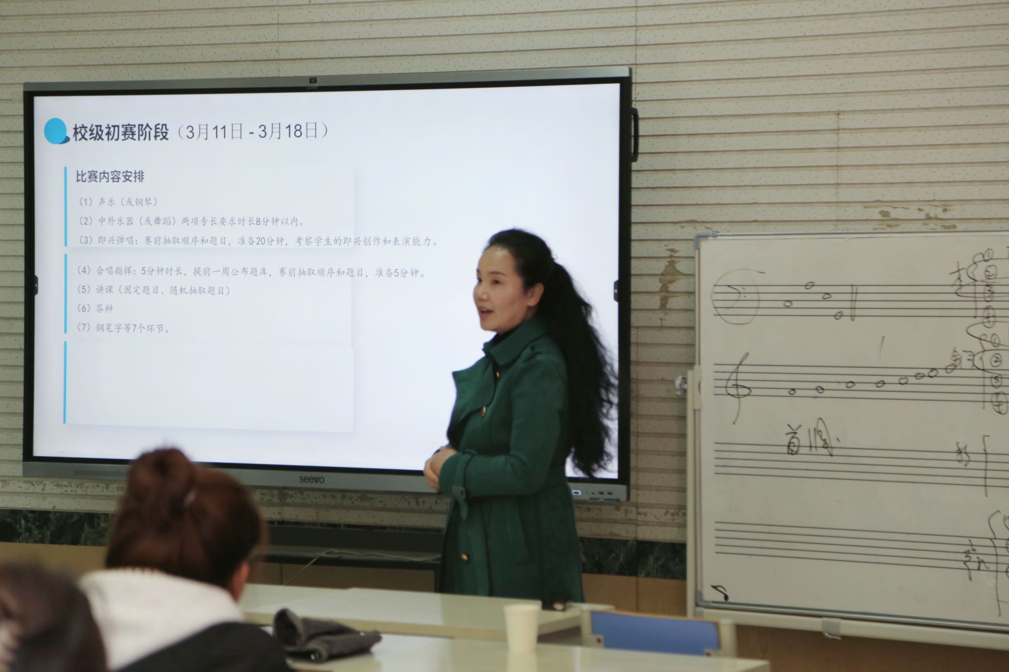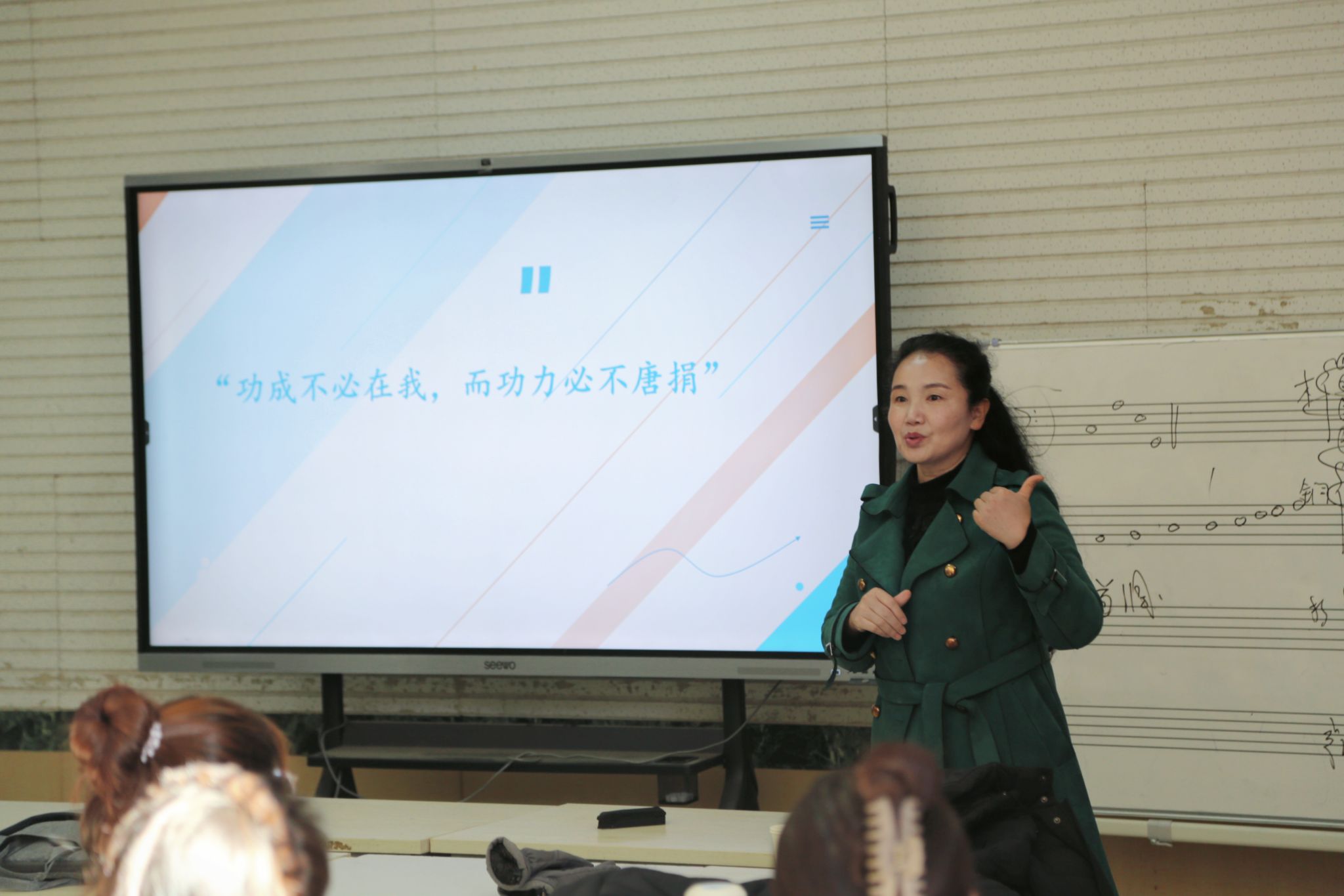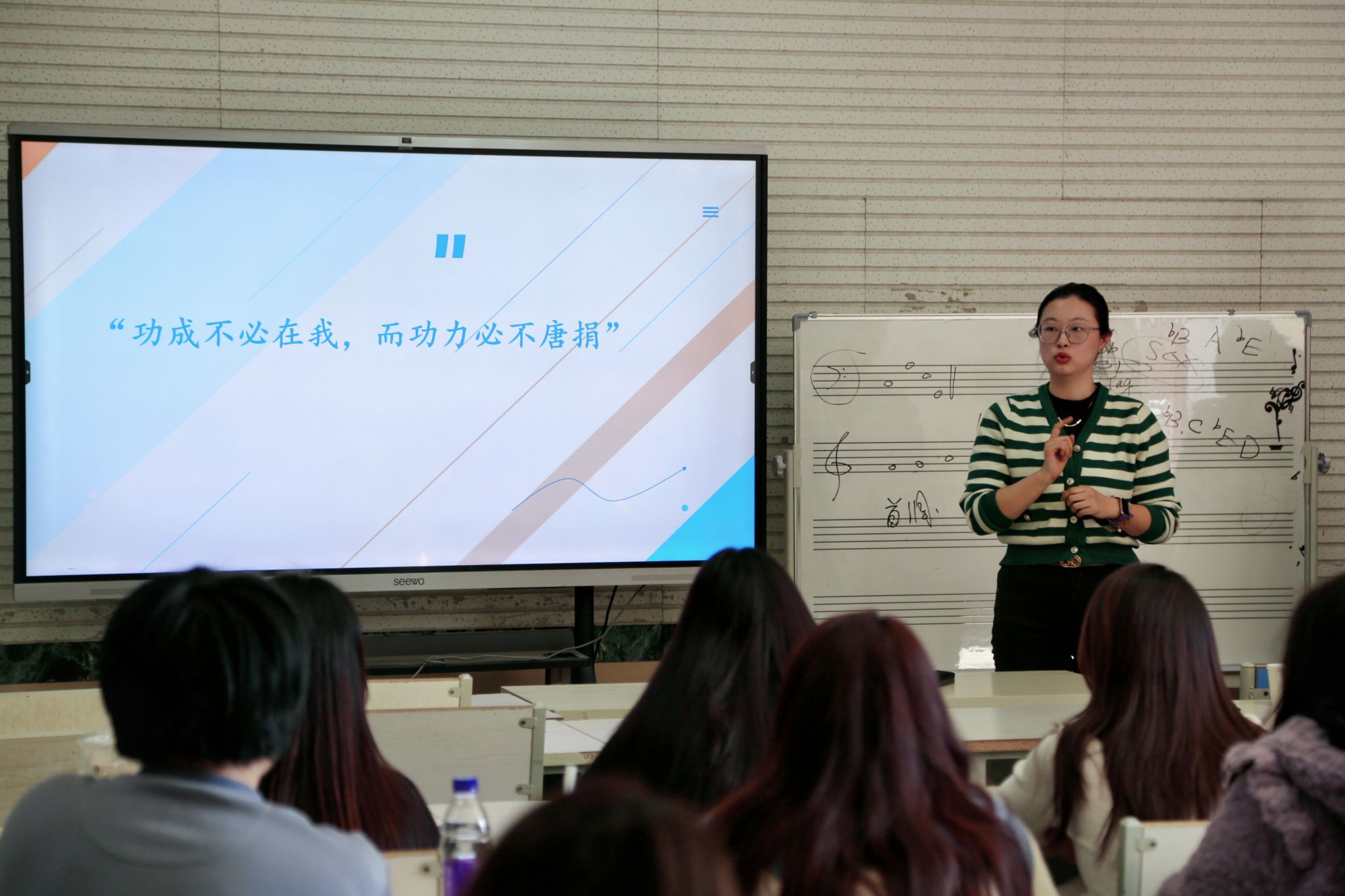 杨瑞教授还针对山东省师范生从业技能大赛的相关政策、比赛流程、比赛的内容、评分标准、重要时间节点等多个方面进行了详尽解读,使同学们对从业技能大赛有了更为全面深刻的理解,为后续参赛奠定了坚实的基础。杨教授强调,大赛对于员工就业、考研以及专业素养的综合提升均具有关键意义,她鼓励全体师范生踊跃参与,为将来踏上教学岗位,成长为优秀的中小学音乐教师奠定基础。