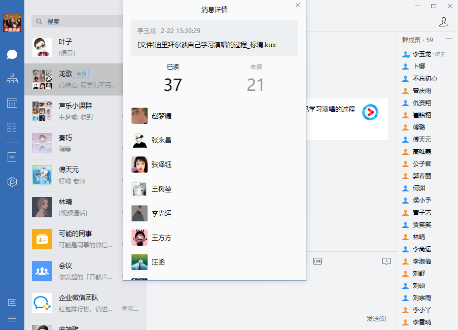 “多方探索,精准施策”——因为是一对一教学,网络授课还算比较成功,但也出现了一些新问题。比如员工的音准问题等,李玉龙老师开发了更多的功能以辅助声乐教学,可以将网络上有价值的教学视频在群里分享给员工,实时查看到已读和未读的员工,便于及时掌握员工的学习状态。