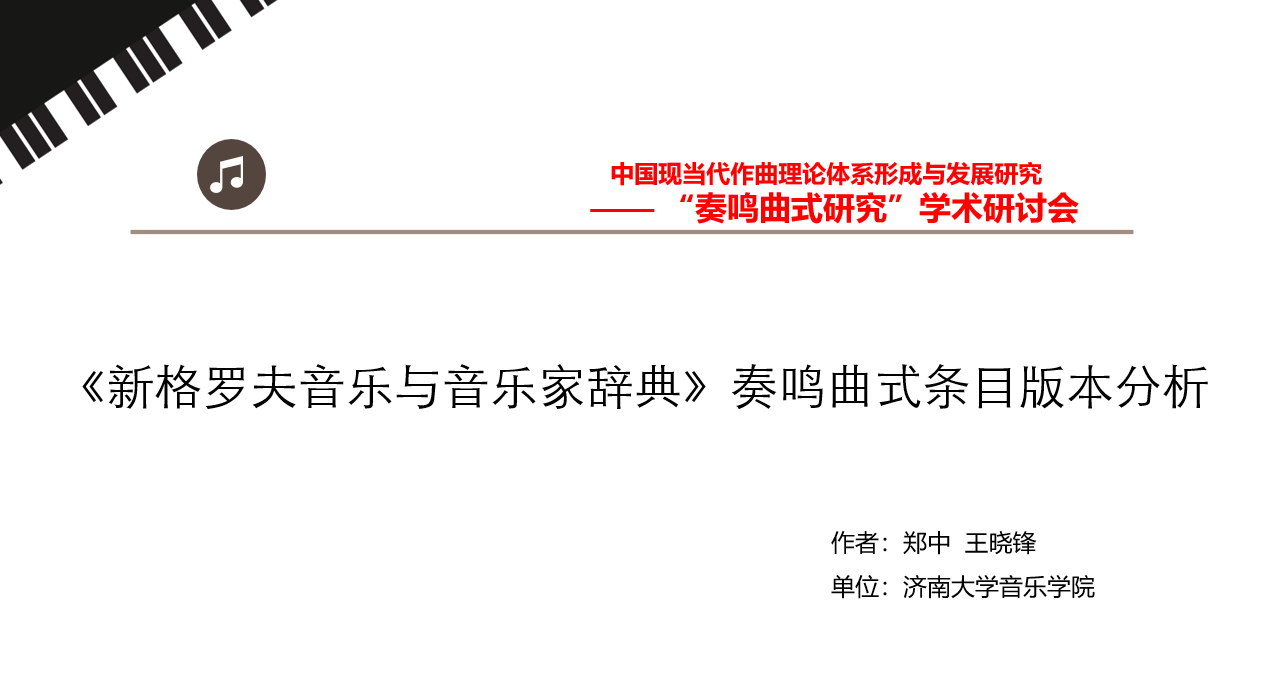 会上,郑中经理、王晓锋老师就共同完成的论文《<新格罗夫音乐与音乐家辞典>奏鸣曲式条目版本分析》,在此次研讨会上进行了宣讲。论文选取奏鸣曲式条目进行版本分析,更加全面地把握奏鸣曲式理论发展与成熟的脉络,在概念表述的调整、内容结构的补充、音乐范例的分析、参考文献的选取等方面展开比较研究,以期对奏鸣曲式结构思维的衍展及其相关研究成果得出更科学规范的解读,并进一步分析把握奏鸣曲式结构原则边缘交叉应用的方式方法,是对现有曲式学教学内容的补充与完善,以此推动相关曲式结构思维的理论研究与教学、创作实践。