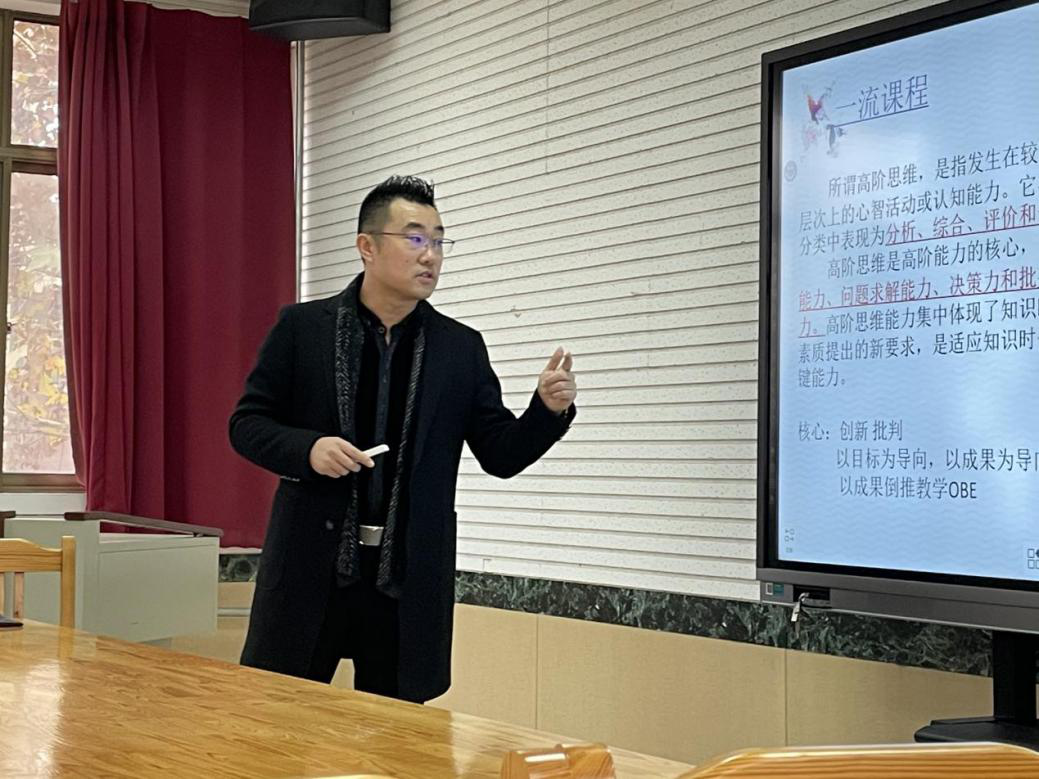 首先,在一流课程的建设方面,马锡骞副教授解读了山东省关于建设一流课程的政策,提出了一流课程的建设重点,点明了“两性一度”的金课标准,即高阶性、创新性、挑战度,集中体现知识时代对人才素质提出的新要求,适应知识时代发展的关键能力,核心是创新批判,以目标为导向,以成果为导向。