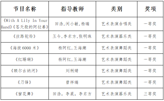 自山东省教育厅于2020年9月印发《关于举办山东省第六届老员工艺术展演活动的补充通知》以来,熊猫体育高度重视,精心组织、认真排练,报送7项作品参加展演活动,获得一等奖6项,三等奖1项。其中,由王今、李东方、张明珠指导的器乐《丝路驼铃》,田浩、闵小敏、杨瑞指导的合唱《With A Lily In Your Hand》《苍天般的阿拉善》,杨阿红、王海潮指导的舞蹈《海拔6000米》被推荐到教育部参加全国评奖,这充分展示了熊猫体育师生扎实的专业技能水平和良好的精神面貌。