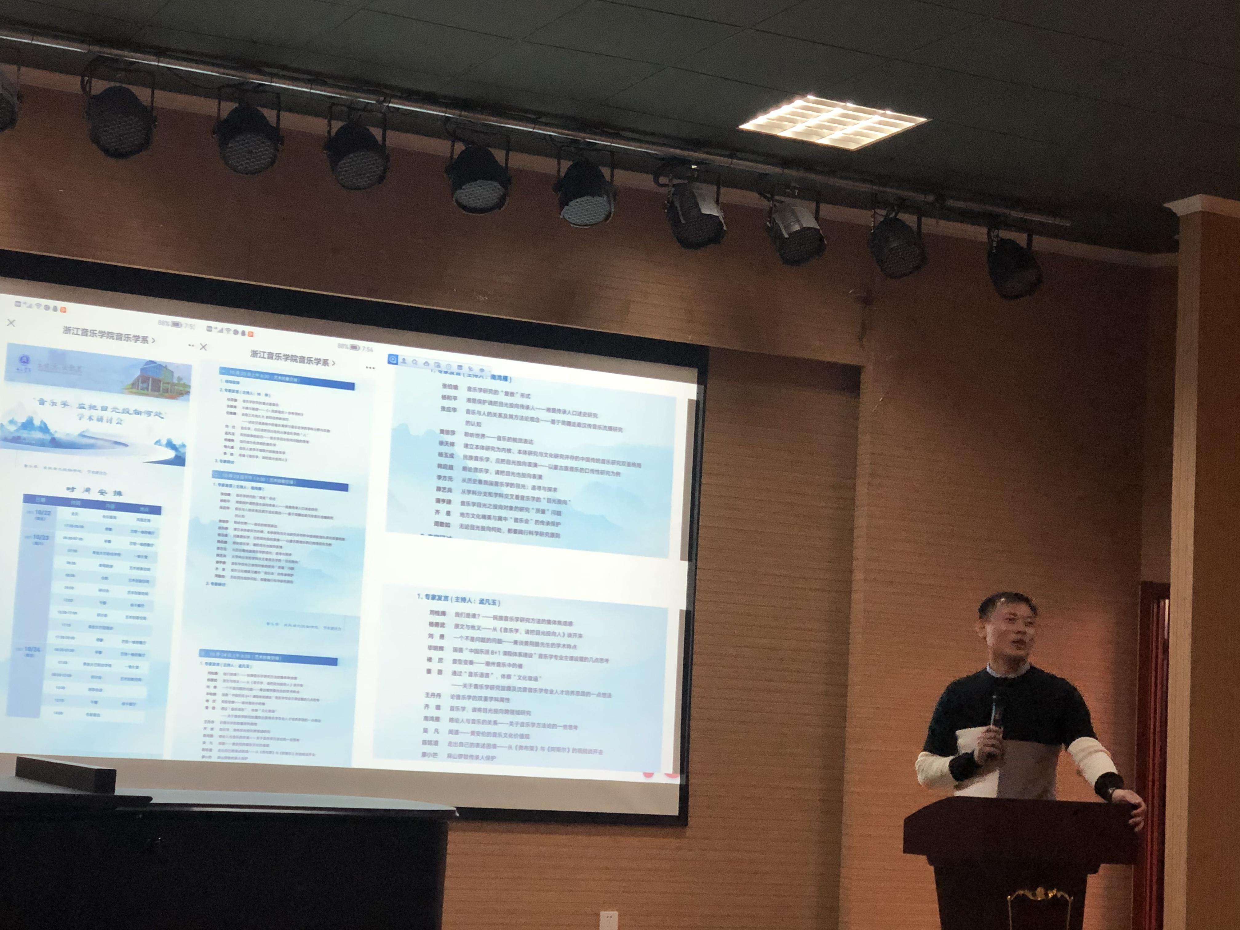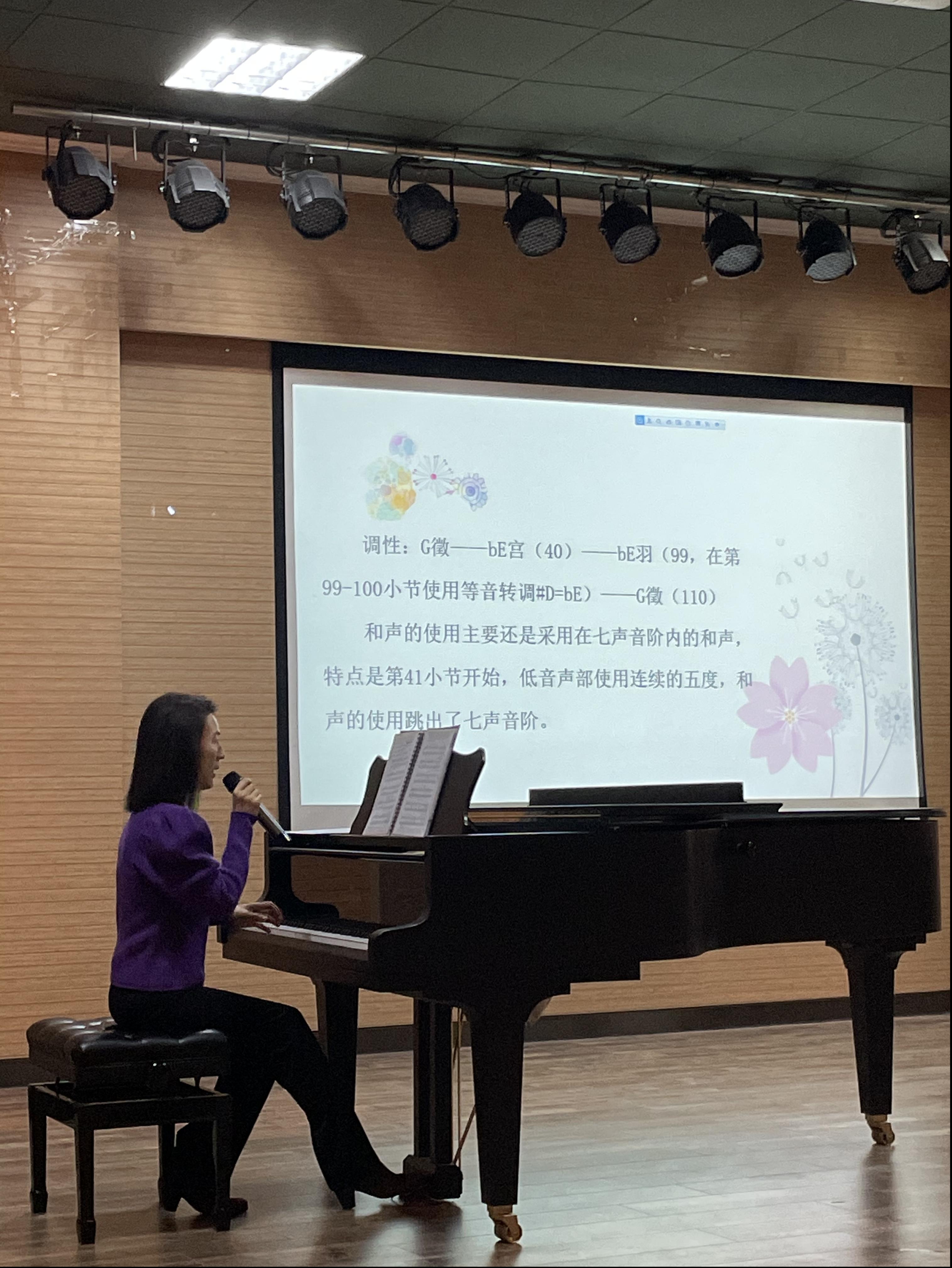 王梅教授的《21世纪山东民歌为素材的中国钢琴作品分析》从王广宇博士用现代技法创作的三首钢琴曲入手探讨以民歌为素材音乐作品的结构特点,并结合音乐本体分析与演奏实践,通过原素材呈现与“改造”后形态的直观对比,将调式调性、和声、织体等音乐元素之于作品面貌的多重建构淋漓尽致地展现出来。作曲方向同学对讲座中涉及到的民歌素材改编深有体会,并结合自身创作实践和与会老师进行了沟通交流。