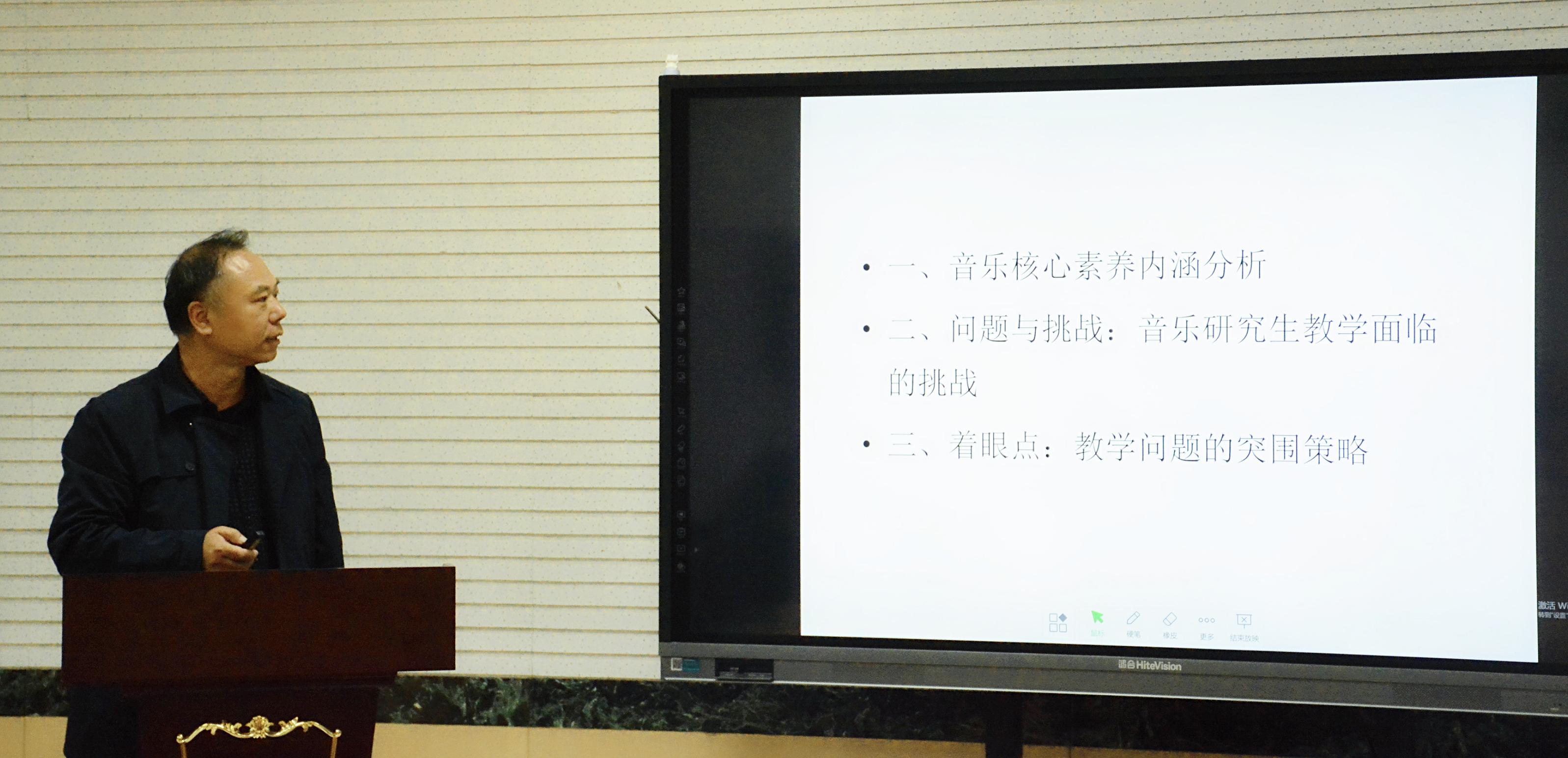 王建成副经理着重从核心素养的内涵培养进行阐述,提出“1+X”的音乐技能构成要素,指出教学中存在“三个分离”——理论与实践分离、专业与文化分离、教学与学术分离的情况,分析了音乐专业学位研究生教学所面临的问题与挑战,并提出相应的应对策略。