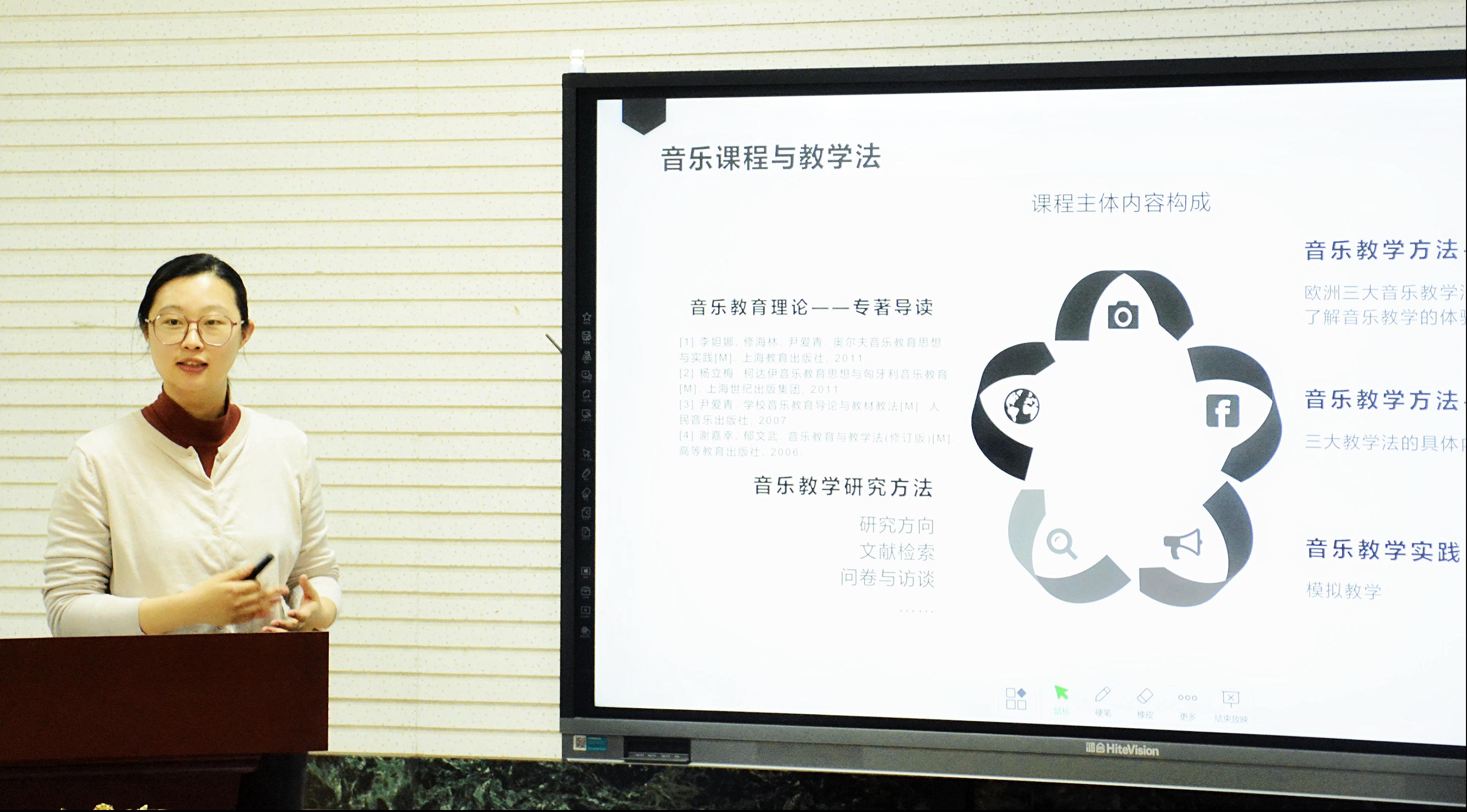近年来,林沛蕾博士也坚持协作类课程的探索,2022年5月,由林沛蕾负责的《综合即兴创编》入选全国艺术专业学位研究生教育指导委员会组织建设的协作类课程案例。在研讨会上,林博士从国家政策、社会需求出发,对音乐教育专业学位研究生教学的总体目标进行“反思式”的阐述,并以《专业英语》的教学改革为实例分享了课程改革创新。