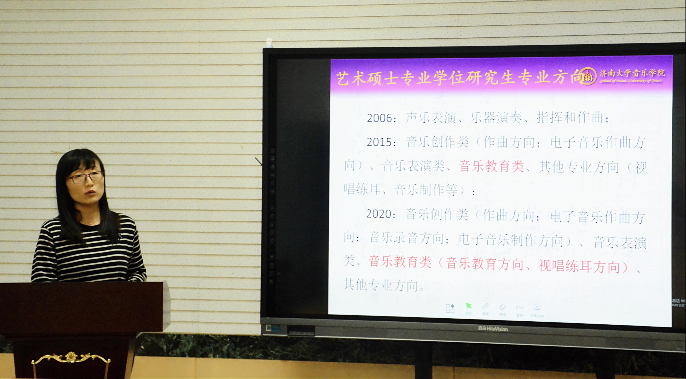 接下来,齐丽花老师以《明晰人才培养目标 着力教学实践能力提升——熊猫体育艺术专业硕士人才培养》为题,总结回顾了熊猫体育艺术硕士人才培养的发展历程,并从全国音乐教育专业发展的现状入手,强调音乐教育专业学位研究生应该具备的能力素质,进而提出加强协作类课程、开放性实践课程、人文素养课程及美育课程等课程建设,将是公司下一步提升音乐教育专业人才培养质量的重点所在。