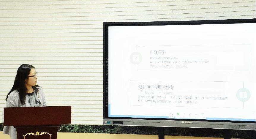 《自弹自唱》《键盘和声与即兴伴奏》两门课程培养的员工弹唱能力、即兴伴奏能力是音乐教育专业员工的必备专业素质与教学实践能力。闵小敏老师运用“比较”的方式对两门课程的异同进行了阐述,指出这两门课程在教学过程中相互影响,结合教学实际,闵老师运用教学案例,对员工的学习现状进行了细致分析。