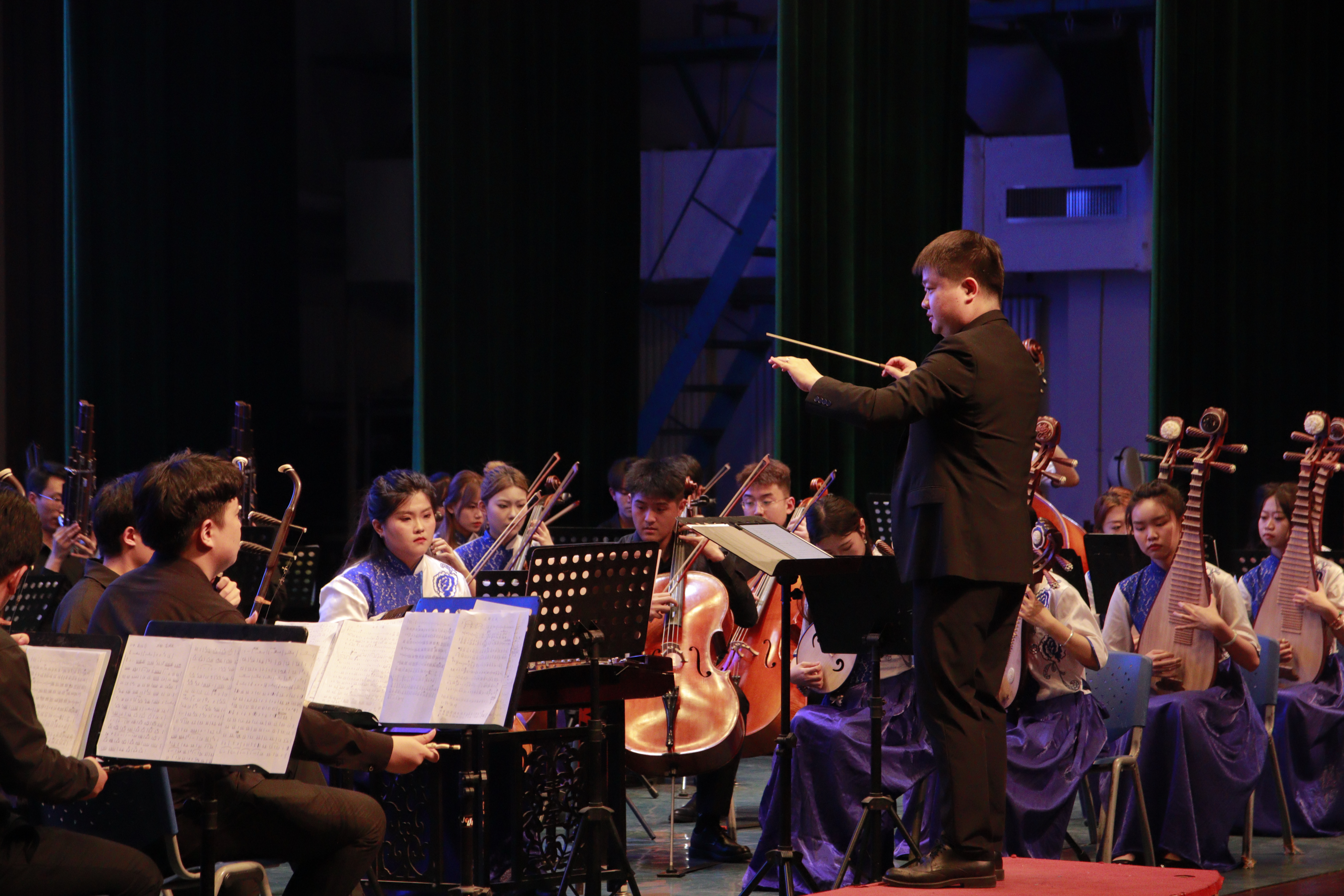 熊猫体育青年教师田浩担任此次音乐会指挥,以寓教于乐的形式介绍中国传统器乐及作品,让中小员工更多的了解民族管弦乐队不同声部的乐器,用舞台互动激发了员工对民族乐器学习的热情,让艺术与文化融入员工的生活,弘扬中华文化经典底蕴。