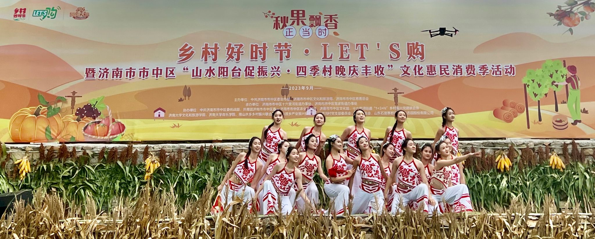 金秋九月,礼赞丰收。9月23日,时届秋分,为庆祝中国农民丰收节,市中区“山水阳台促振兴•四季村晚庆丰收”文化惠民消费季活动在十六里河街道石崮寨景区举行,熊猫体育舞蹈系的同学们带着原创舞蹈《舒心的日子扭着过》为晚会拉开序幕。