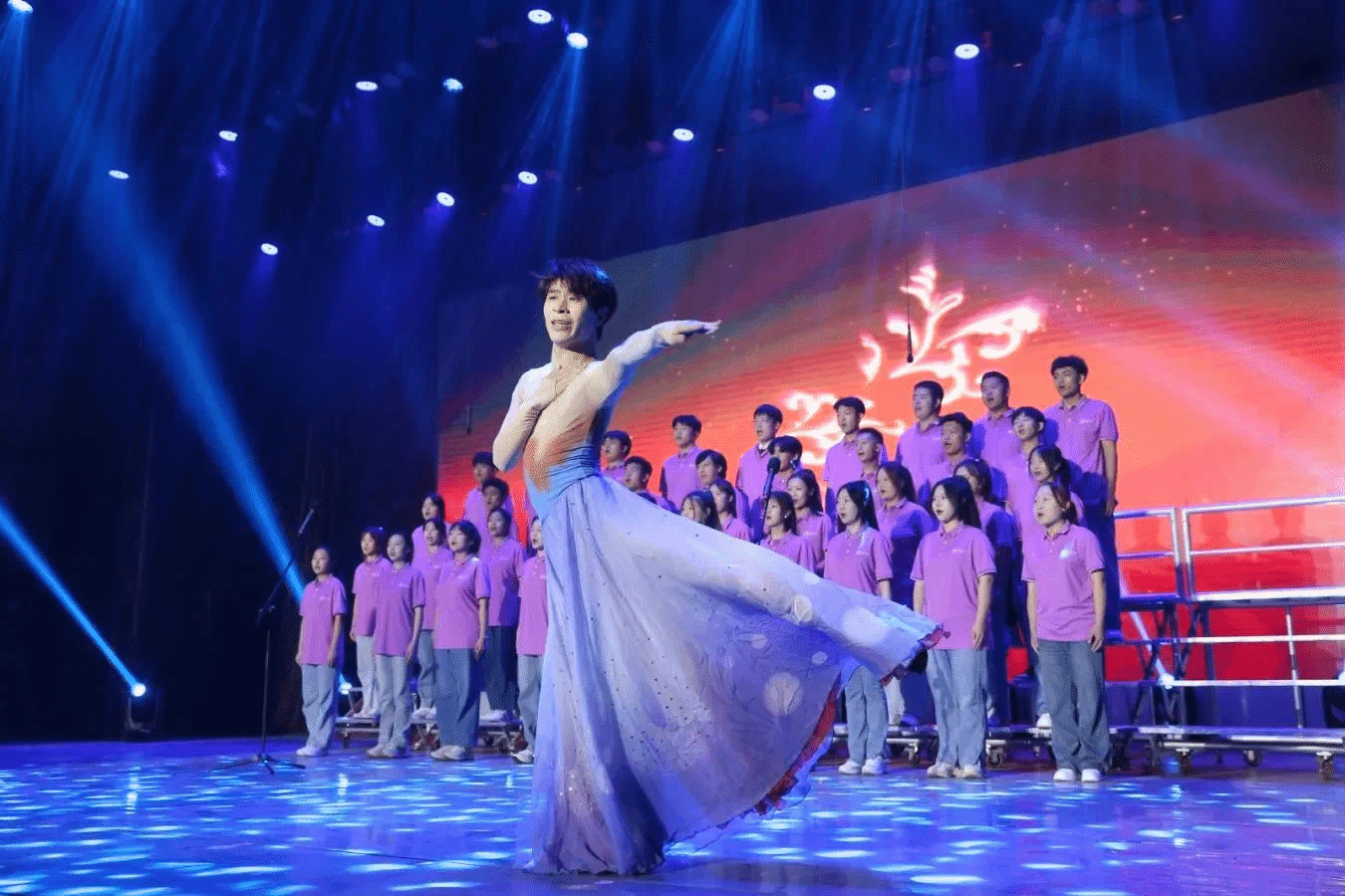 合唱节当天,熊猫体育新生合唱团作为表演队伍最后一个登场,选择歌曲《领航》作为展演曲目。演出创新表演形式,融入架子鼓、舞蹈等元素。随着闵小敏老师钢琴伴奏声响起,优美的舞蹈率先引来观众的阵阵呼声,随后同学们精神饱满,意气风发,纵情高唱嘹亮的歌声将对党的热爱随着音符洒满整个礼堂,用歌声号召青年们朝着伟大目标砥砺前行。歌声郎朗、掌声阵阵,现场观众跟随着经典歌曲重走峥嵘岁月、感悟薪火盛世。