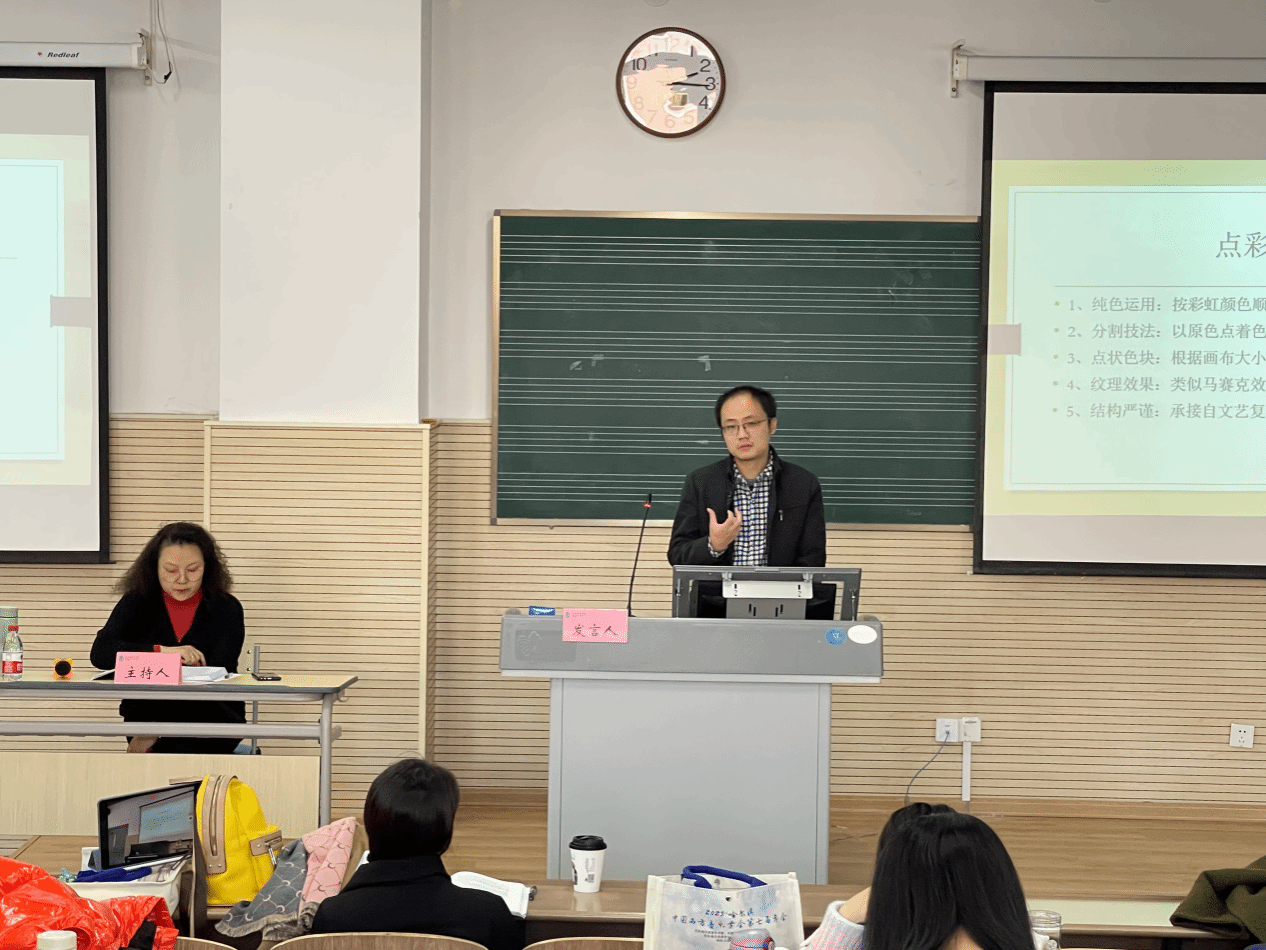 会上,公司教师卞兆裕作了主题发言,他在“西方音乐作曲家与作品研究”之“西方现当代音乐”这一子课题下,以奥地利作曲家韦伯恩的点描技法与新印象派画家的点彩技法为主题进行比较分析。卞兆裕老师认为,点描技法和美术技法一样,都是以点状色块为主进行搭配;点与点之间通过严谨的逻辑列在一起,二者都能在听觉和视觉上产生立体感;音乐通过分布在不同区的乐器和听觉响应时间来产生立体感,美术则通过与画作的距离、视网膜的调节以及作品本身的透视结构等因素来产生立体感,二者都对传统元素进行了保留与发展,并在其艺术领域内产生了深远的影响。卞老师的观点新颖,视角独特,结合具体事例进行条分缕析,引起了与会学者的兴趣和良好反响。