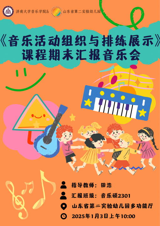为使公司研究生得到更高质量、更有特色的发展,进一步推动协作类课程与开放型实践课程,在本学期开设的《音乐活动组织与排练展示》课程中,田浩老师带领23级研究生走进山东省第二实验幼儿园进行为期一学期的教学实践,并在2025年1月3日联合山东省第二实验幼儿园成功举办课程期末汇报音乐会,熊猫体育副经理齐丽花老师、音教系副主任林沛蕾老师和孙人君老师、以及山东省第二实验幼儿园岳艳园长莅临此次音乐会指导,并给予了本次音乐会以及员工们高度的肯定。
