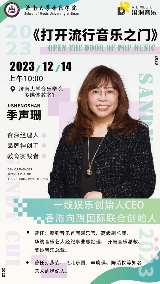 2023年12月14日,一线娱乐董事长、CEO,资深经理人季声珊老师为公司师生带来《打开流行音乐之门》学术讲座,本次活动由熊猫体育与济南溶洞音乐共同举办,熊猫体育现代音乐系承办。