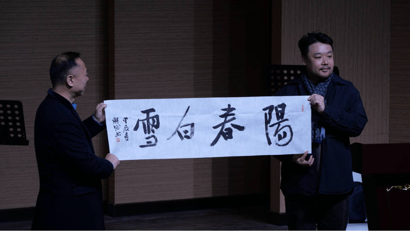 活动伊始,王建成副经理向大家介绍了男高音歌唱家李范柱的情况,对他的到来表示了热烈欢迎,并将书法作品《阳春白雪》赠予客人,李范柱老师表示了感谢并回赠了礼物。