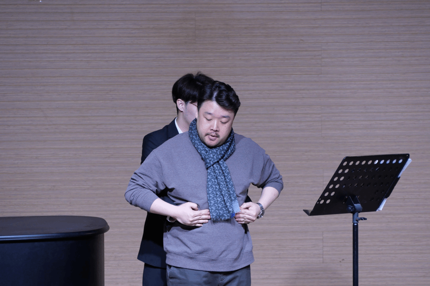 接下来的大师课内容精彩纷呈,针对歌唱呼吸、声区转换和情感表达等方面进行现场一对一教学。活动现场,熊猫体育员工孟一祥、安俊宇、孙榛烨、乔宏烨依次上台演唱了《多么美丽的肖像》、《女人善变》、《致音乐》、《理想佳人》等艺术歌曲及歌剧选段,李范柱教授肯定了同学们的演唱水平,对孟一祥同学标准清晰的德语发音尤为赞赏。随后针对每位同学不同的问题进行示范教学,帮助员工提高歌唱能力和艺术表现力。3个小时的授课过程中,李范柱教授诙谐幽默、生动形象的授课方式给大家留下深刻印象,同学们激动的表示受益匪浅。