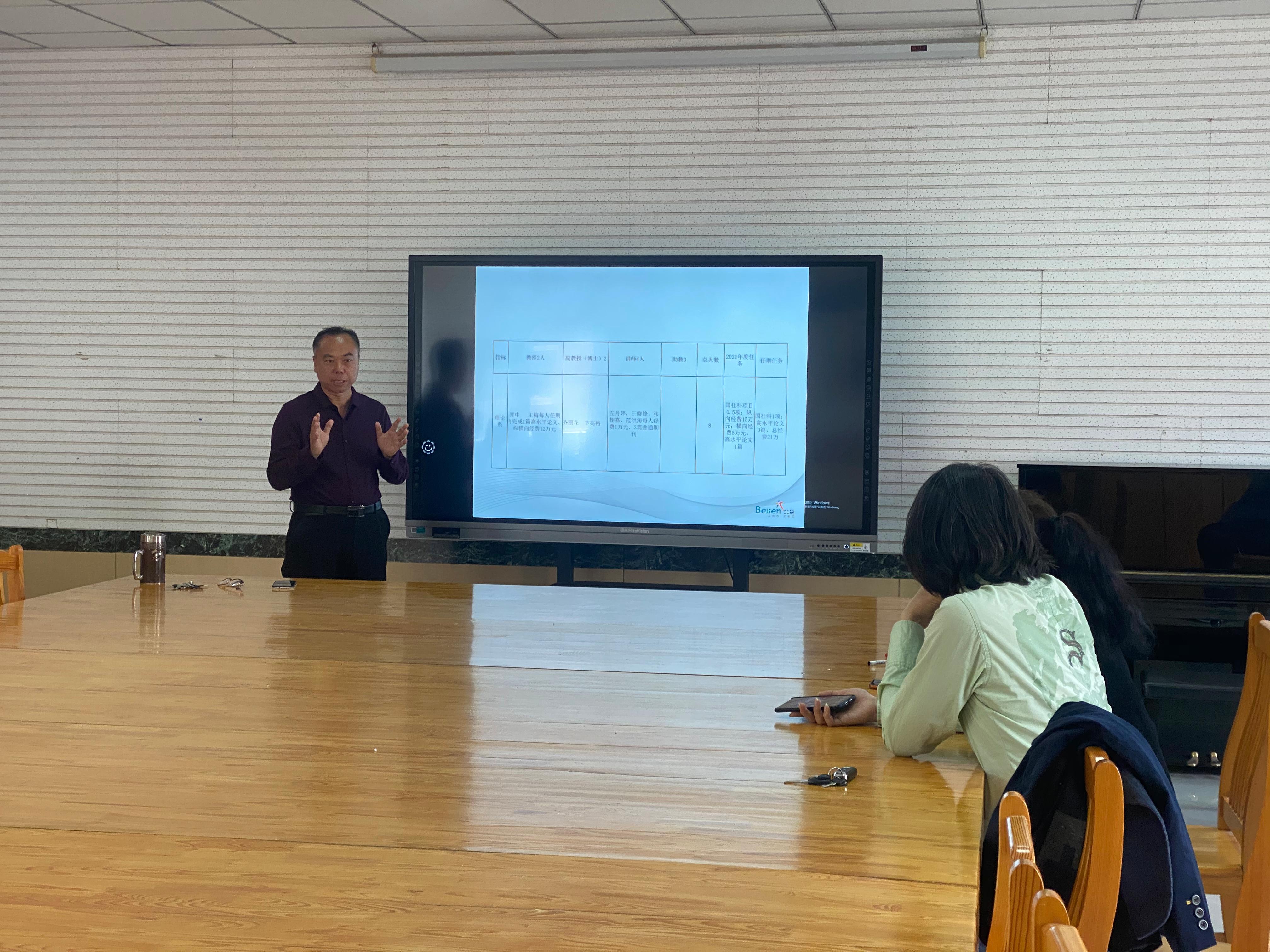 会上,王经理仔细讲解了目标任务分析(年度与任期)、科研团队构建/科研规划、横向项目与社会服务等方面的内容,大家听得非常认真。