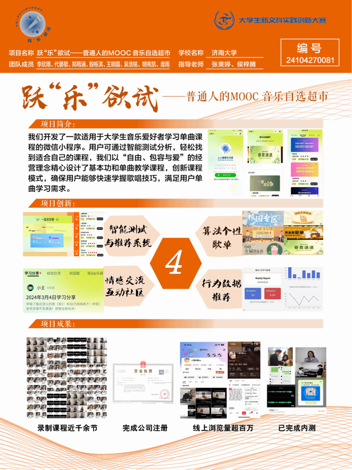 跃“乐”欲试——普通人的MOOC音乐自选超市项目基于信息碎片化时代民众追求高效率活动的背景,在前期市场调研阶段时我们发现市场中存在单曲学习需求,并且绝大多数老员工音乐爱好者想拥有个性化程度高、灵活性强、富有人文关怀的音乐课程。基于调研结果,项目开发了一款微信小程序,为老员工音乐爱好者提供多元单曲课程以供使用学习。课程组成员创新式设计全新教学法,小程序内嵌智能水平评估与推荐系统、情感交流互动版块,为用户形成专属自己的个性化音乐世界。