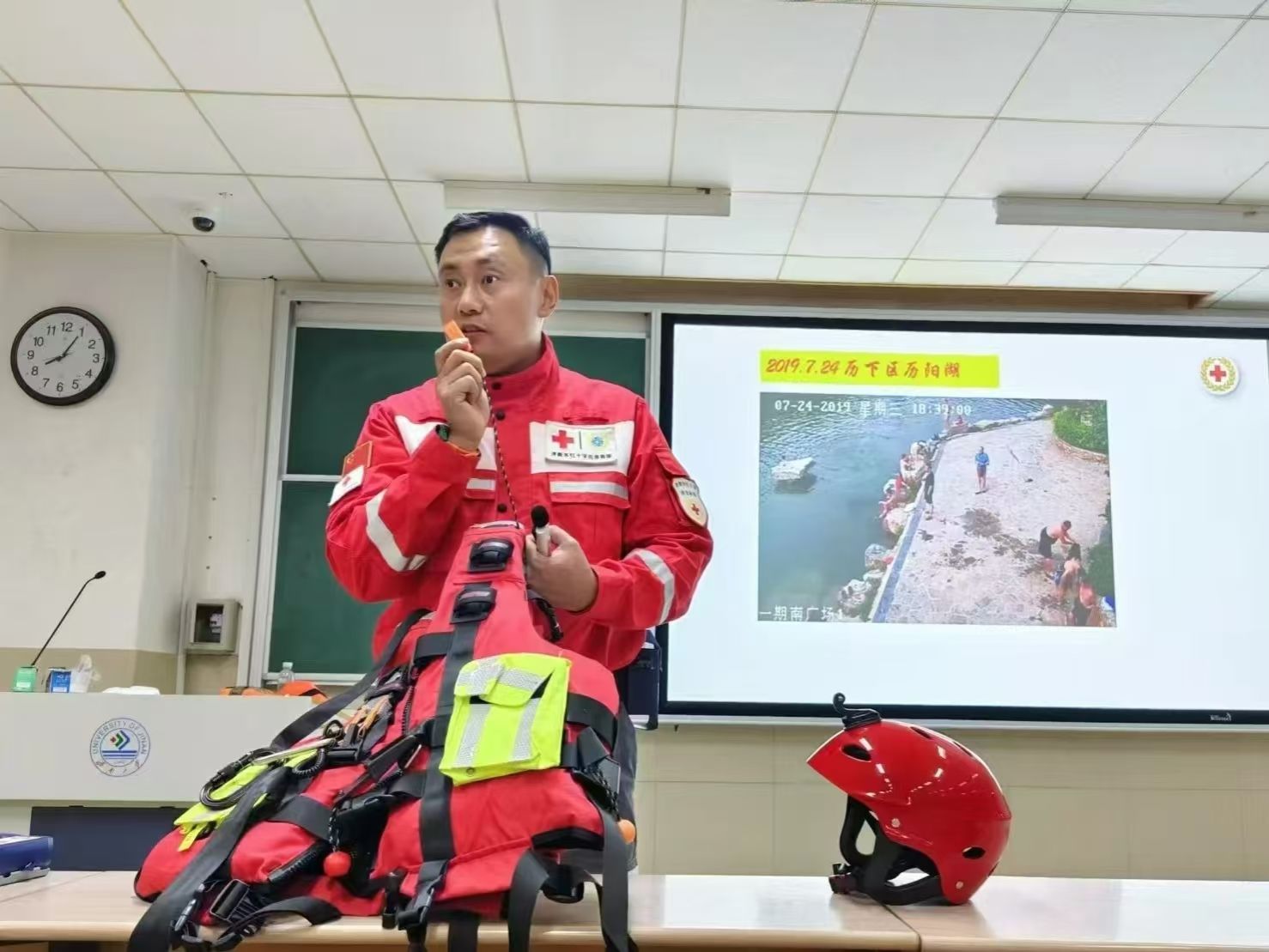 任海涛作为济南市红十字应急救援队的一员,曾多次参与全国各地特大水灾的救援工作。他从自身经验和老员工实际情况出发,对高校中近期频发的溺水、踩踏等危机事件,与同学们分享了应对措施和解决办法。同时,他建议同学们应掌握基本自救和互救技能,定期参加公司或社区组织的安全培训,提高自我防范意识和应急能力,减少校园内外的意外伤害事件。